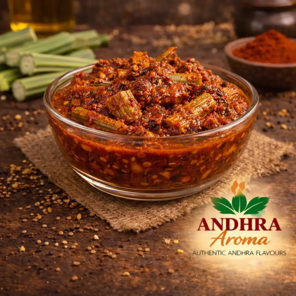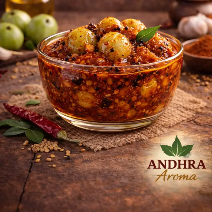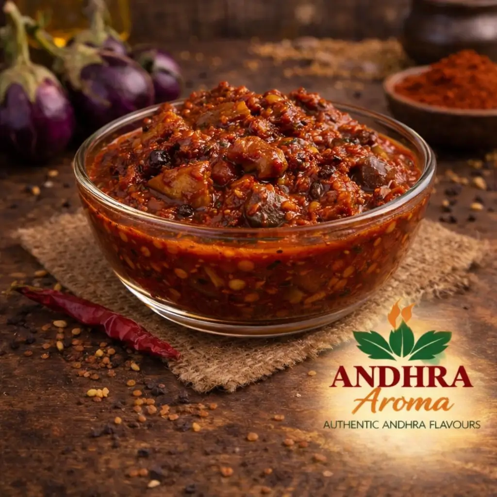 Rich, spicy brinjal pickle bursting with authentic Andhra flavors.