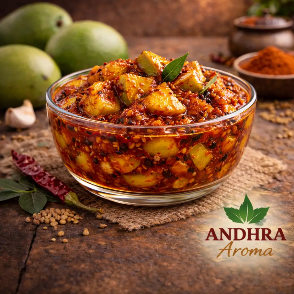 Authentic Andhra-style mango pickle made with handpicked raw mangoes and traditional spices