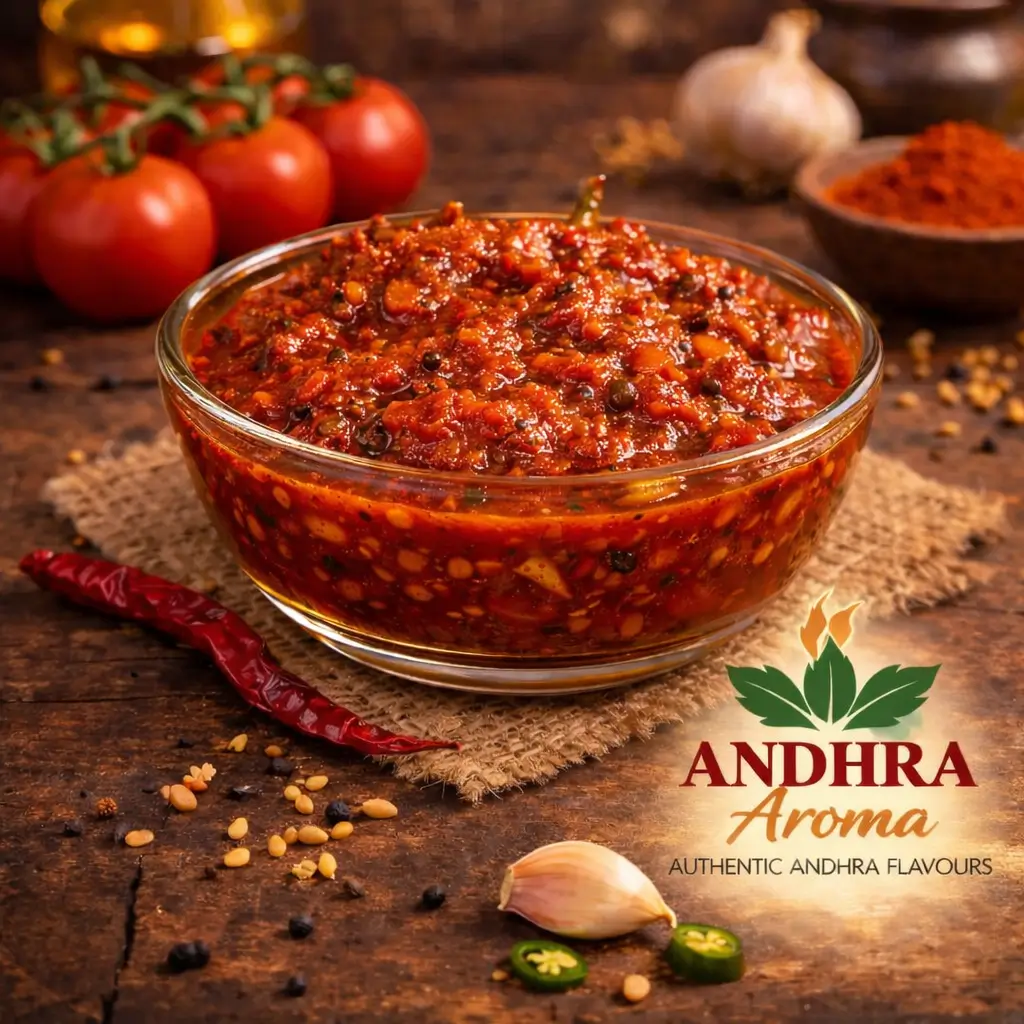Spicy and tangy tomato pickle with a perfect blend of Andhra spices - Traditional & Homemade