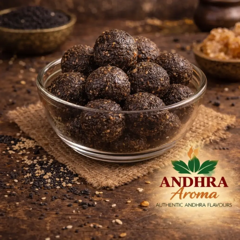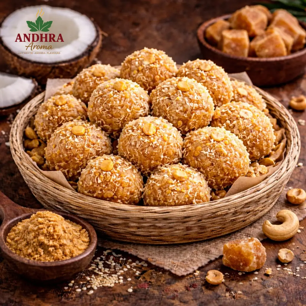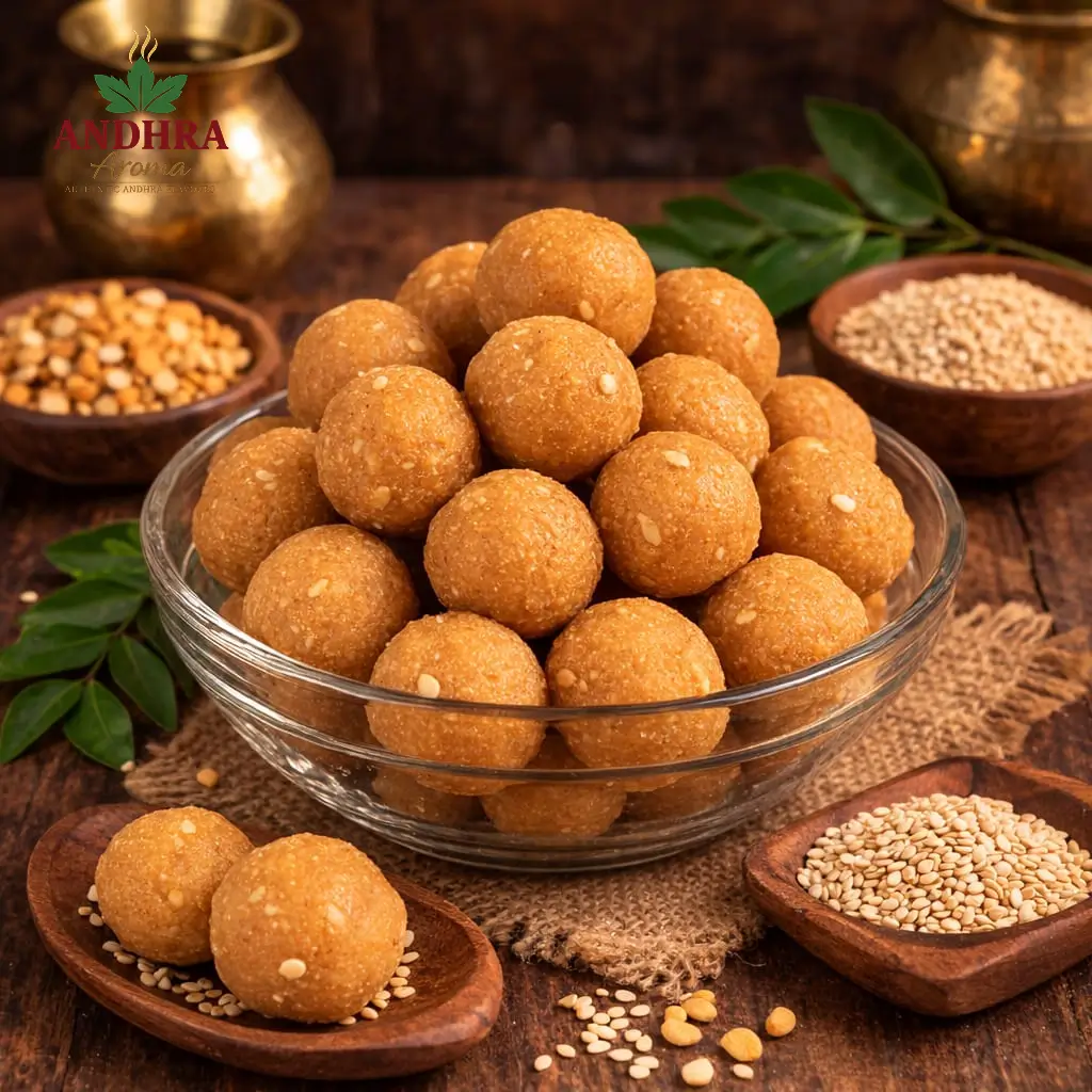 Protein-rich Andhra laddus made with roasted urad dal and pure ghee.